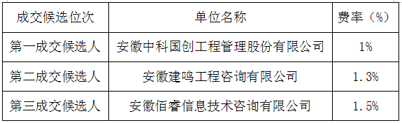 根據(jù)公平、公正、公開(kāi)原則,確定本次項(xiàng)目招標(biāo)代理公司成交單位為:安徽中科國(guó)創(chuàng)工程管理股份有限公司。
