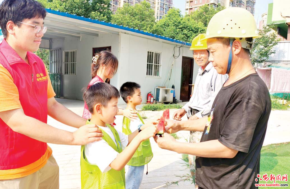 7月10日,金安區(qū)三里橋街道金裕社區(qū)工會(huì)、金裕社區(qū)團(tuán)支部組織大學(xué)生志愿者與轄區(qū)兒童,走進(jìn)在建工地開(kāi)展“夏日送清涼”活動(dòng),為奮戰(zhàn)在高溫一線的建筑工人送去西瓜、礦泉水等防暑物資及真摯關(guān)懷。
