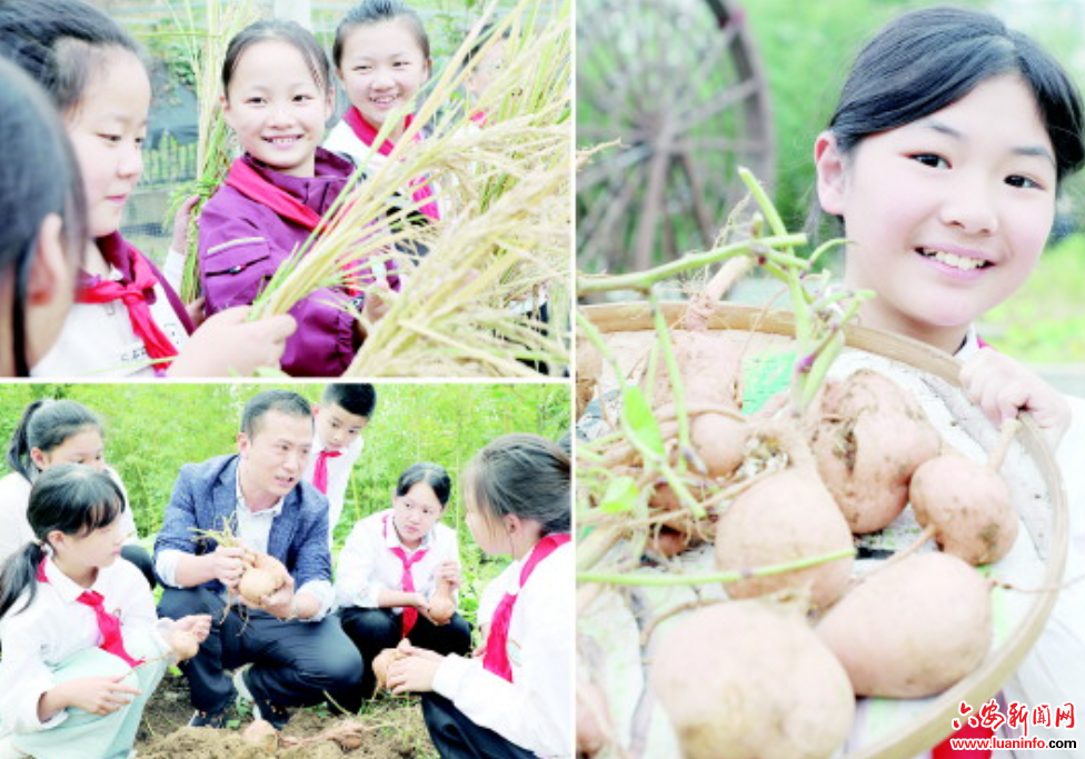 右圖:淠河小學(xué)的學(xué)生展示在校園勞動(dòng)實(shí)踐基地采收的紅薯,分享豐收喜悅。
