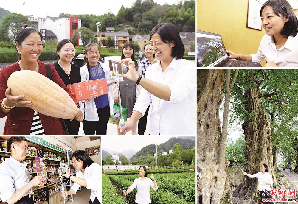 左上:9月30日,余靜在拍攝過上小康生活的大灣村村民幸福的笑容。左下:9月30日,余靜在拍攝大灣村“明星戶”陳澤申介紹自己的小康生活。下中:9月30日,余靜在大灣村連片的茶園里錄制視頻,介紹大灣村茶產(chǎn)業(yè)。右上:9月30日,余靜在電腦上選擇拍攝的圖片和視頻。右下:9月30日,余靜在拍攝大灣村十二檀景區(qū)的古檀樹。 皖西日報(bào)融媒體記者 陳力 攝