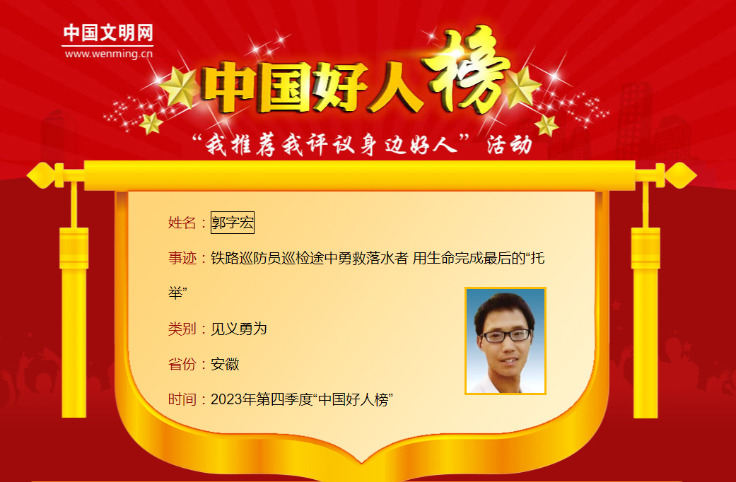 ??郭字宏,男,1975年10月生,安徽省六安市金寨縣梅山鎮(zhèn)三灣村安林組居民,生前系上海滬鐵保安服務(wù)有限公司保安,滬蓉高鐵金寨工區(qū)巡防員。2023年8月2日中午,正在三灣村鐵路橋上巡防的郭字宏聽(tīng)到河道中有人呼救,危急時(shí)刻,他毫不猶豫跳入深水,一次次潛入水底搜救,在生命的最后時(shí)刻奮力將落水者托舉出水面,把生的機(jī)會(huì)留給了別人,自己卻因體力不支,沉入水底。郭字宏曾入選“見(jiàn)義勇為勇士榜”。