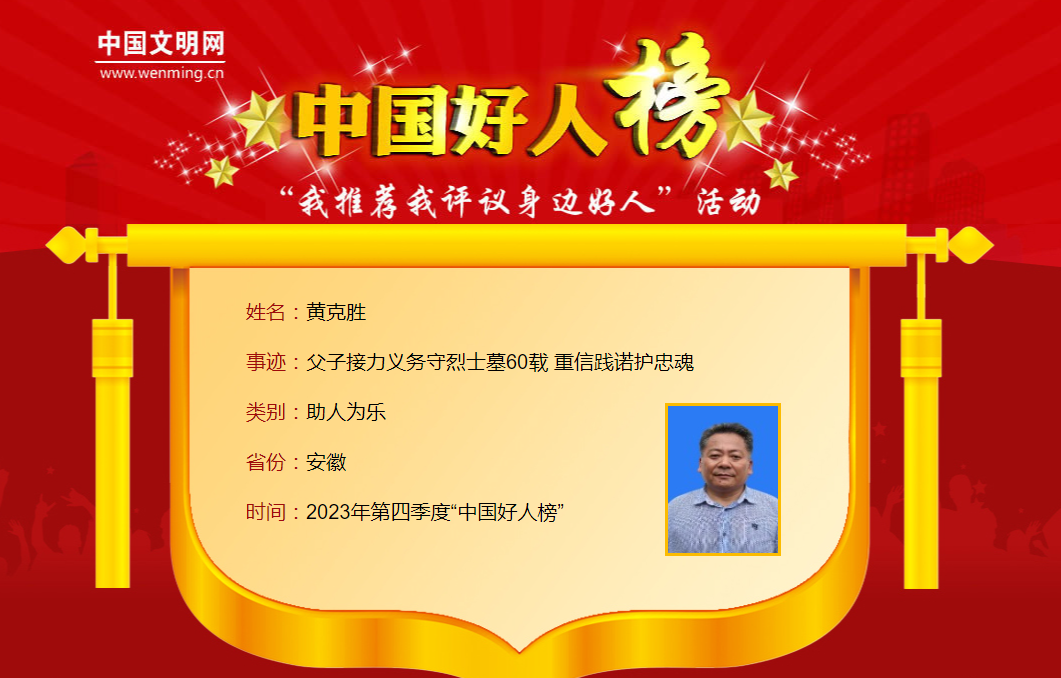 黃克勝,男,1971年6月生,中共黨員,安徽省六安市金安區(qū)東河口鎮(zhèn)毛嶺村花門樓組居民。黃克勝的家鄉(xiāng)毛嶺村有座無名烈士墓,70多年前,13名烈士長眠于此。黃克勝的父親黃昌華自發(fā)義務(wù)為無名烈士守墓44年,父親去世后,黃克勝牢記父親囑托,辭去外地工作回鄉(xiāng)繼續(xù)守墓,至今已16載。黃克勝踐信守諾,與父親接力義務(wù)守墓60余年從未間斷,他們以革命老區(qū)人民樸實的行動守護革命先烈、傳承紅色基因,讓革命精神接續(xù)傳承。黃克勝曾榮獲安徽省“青年五四獎?wù)隆薄不帐〉赖履7短崦劇?/font>